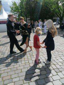 Um 12:30 begann dann der spannendste Teil unseres Tages auf dem Schlossplatz: Für eine halbe Stunde durften wir uns dem neugierigen Publikum mit einer Bühnenshow vorstellen. Den Anfang machten hier zwei Kinderpaare aus unserer Kindertanzgruppe, welche mit einer Rumba und einem Cha Cha Cha präsentierten, was sie schon beherrschten. Danach zeigten zwei unserer Breitensportpaare ihr Können. Mit Florian & Lea (Hautgruppe) und Walter & Elke (Senioren IV) wurde klar, dass Tanzen wirklich keine Frage des Alters ist. Florian und Lea zeigten eine Rumba und einen Cha Cha Cha, Walter und Elke begeisterten mit einem