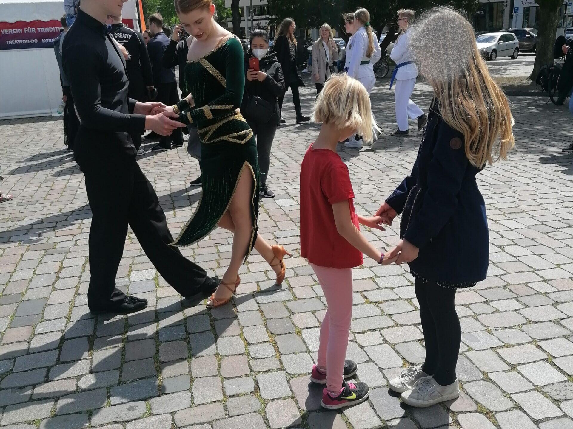 Neue Kinder sind jederzeit herzlich willkommen! Gern könnt ihr sie über das Kontaktformular anmelden. Dann stellen sich die Betreuerinnen auf Neulinge ein. Damit sich die Kinder voll auf sich, die Gruppe und das Tanzen konzentrieren können, bleiben Eltern und andere Begleitpersonen während der Tanzstunden nach Mögichkeit (und ggfs. nach einer Eingewöhnungszeit) draußen. Bitte seid so frühzeitig da, dass die Kinder pünktlich zum Gruppenstart lostanzen können.