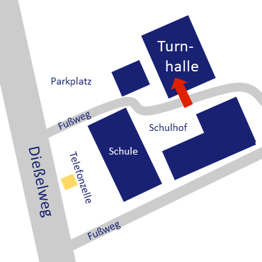 Um zur Aula zu gelangen, gib als Ziel einfach „Gorch-Fock-Straße“ in dein Navi ein. Dann fährst du die Straße bis zum Ende durch und kannst auf dem Schulhof parken. Am gegenüberliegenden Ende des Schulhofs geht rechts am Gebäude eine Außentreppe hoch, über die du zur Aula gelangst.
