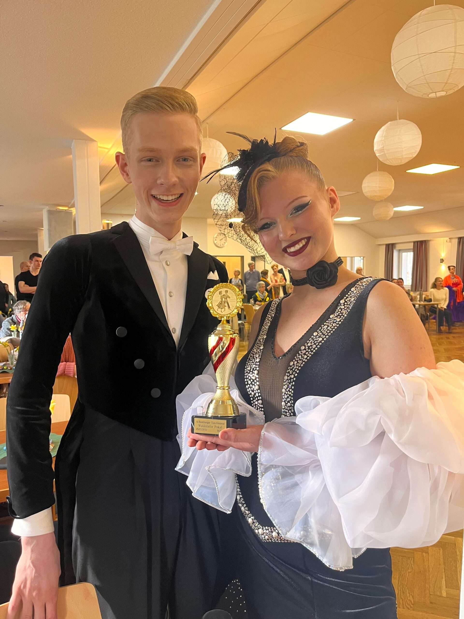 In der HGR B Standard mit 7 Paaren konnten am Sonntag beim Walddörfer SV Lukas Blum und Janina Christiansen nach einer längeren Turnierpause trotz der äußerst rutschigen Fläche 3 der 5 Tänze im Finale für sich entscheiden und durften als Belohnung für den Sieg nicht nur eine Platzierung, sondern auch den Pokal mit nach Hause nehmen. „Tolle Supporter haben uns das ganze sehr erleichtert“, so Janina „und besonders schön war es, mit Menschen auf der Fläche zu stehen, die man sehr gern hat. Eine Tanzverbindung ist einfach etwas Unbeschreibliches.“