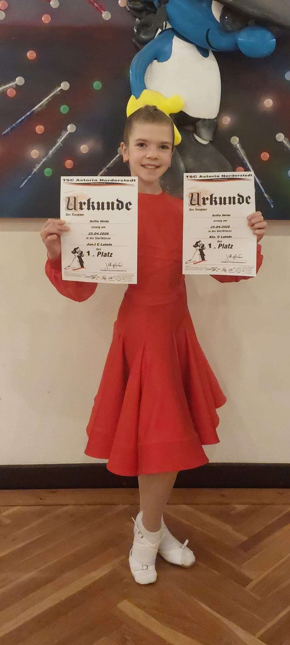 Zunächst einmal ging Sofiia am Samstag aber in den Solos der Jun I C und der Kin C Latein an den Start. In beiden Turnieren setzte sie sich unangefochten an die Spitze und ertanzte sich mit Platz 1 von 11 und Platz 1 von 5 zwei Mal die Goldmedaille. Diese Erfolgsserie konnte sie auch in den Solos der Jun I C und Kin C Standard weiter fortsetzten. In diesen Turnieren belegte sie Platz 1 von 6 und Platz 1 von 5 und wurde dafür mit Goldmedaille drei und vier belohnt und natürlich als Krönung mit dem Aufstieg in die B Klasse.